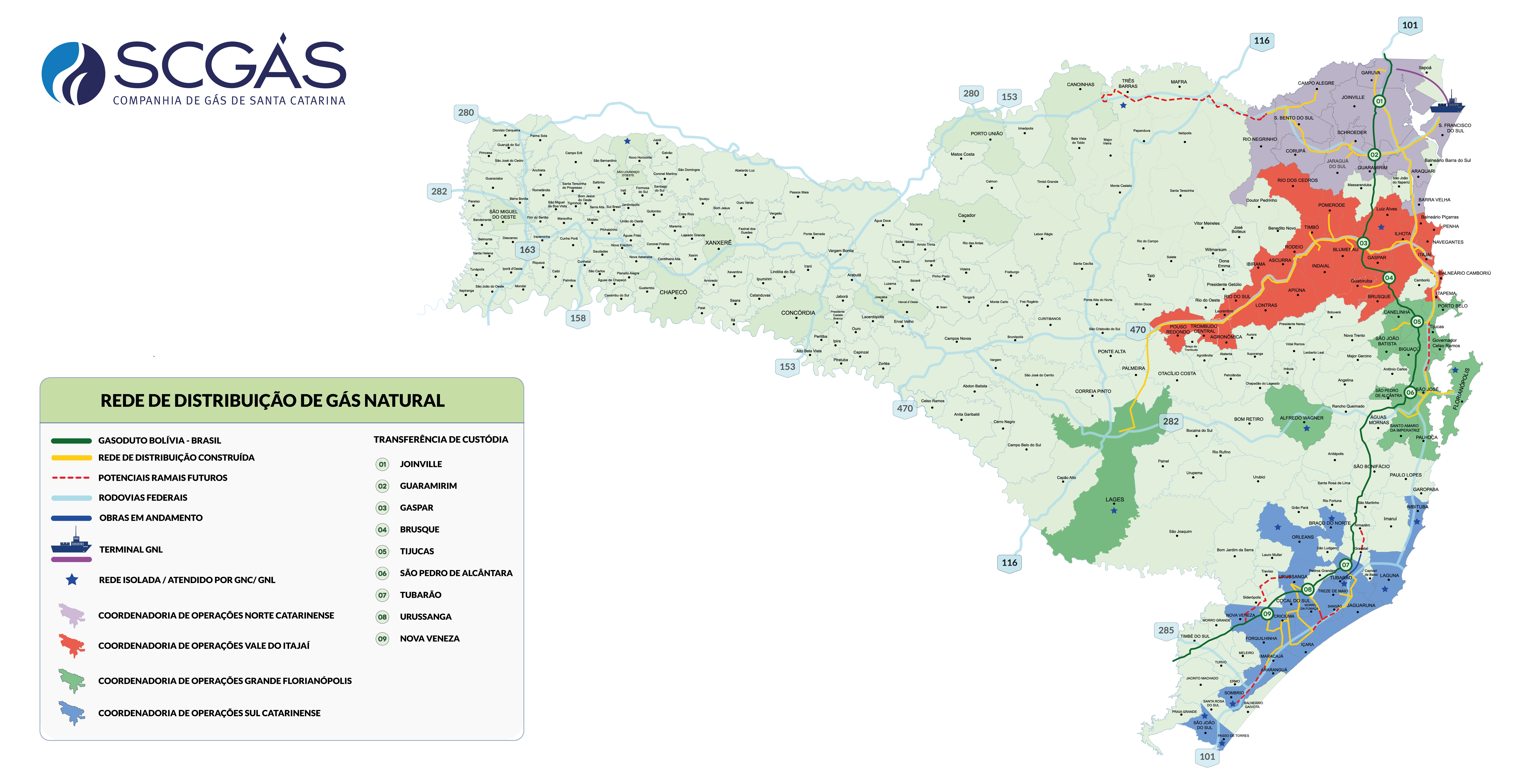 Santa Catarina possui atualmente 72 municípios atendidos com gás natural, entre municípios atendidos pela rede de distribuição de gás natural (RDGN) e municípios que recebem o gás através do modal GNC, que leva o gás natural comprimido através de caminhões.